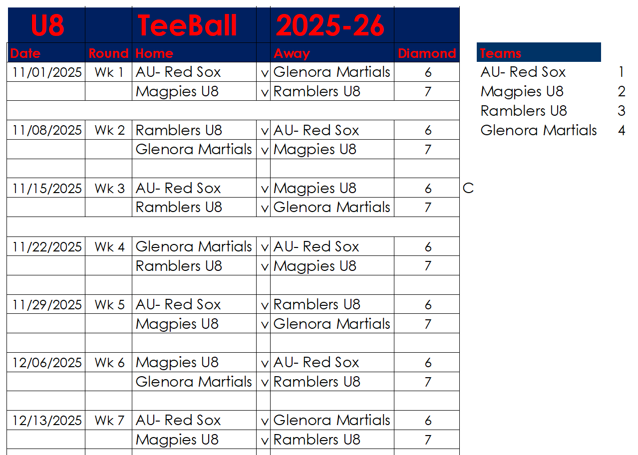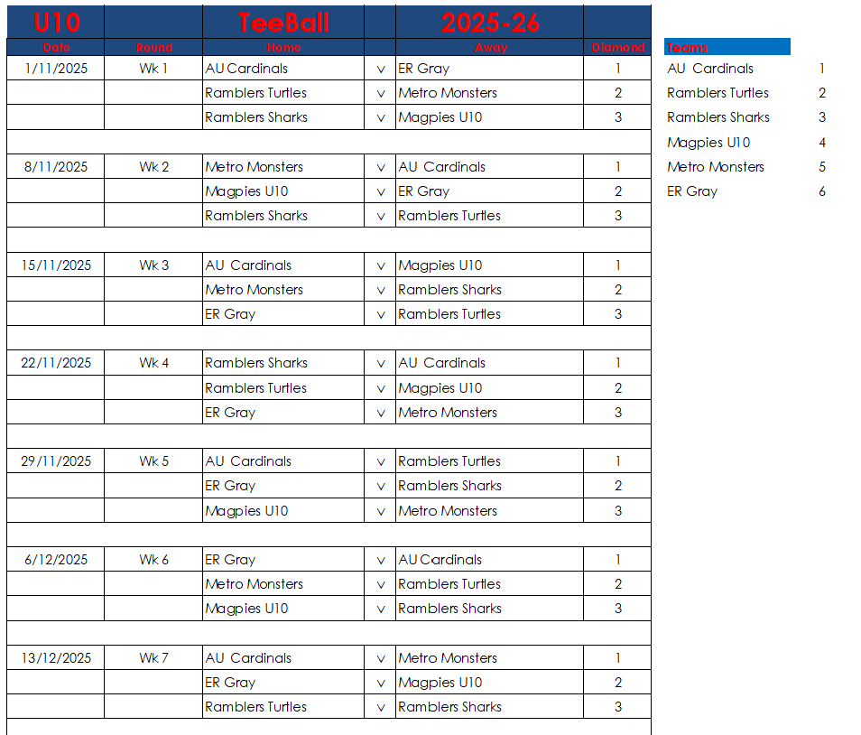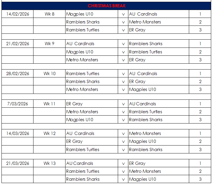 Hello everyone, Please find below the draw for our Grassroots Module, featuring teams from U6 to U10. All games will be played at Fowlds Park, starting at 9:00 AM on Saturday mornings. If you would like to register your child, please contact us now. Kind regards, AU Junior Committee Members